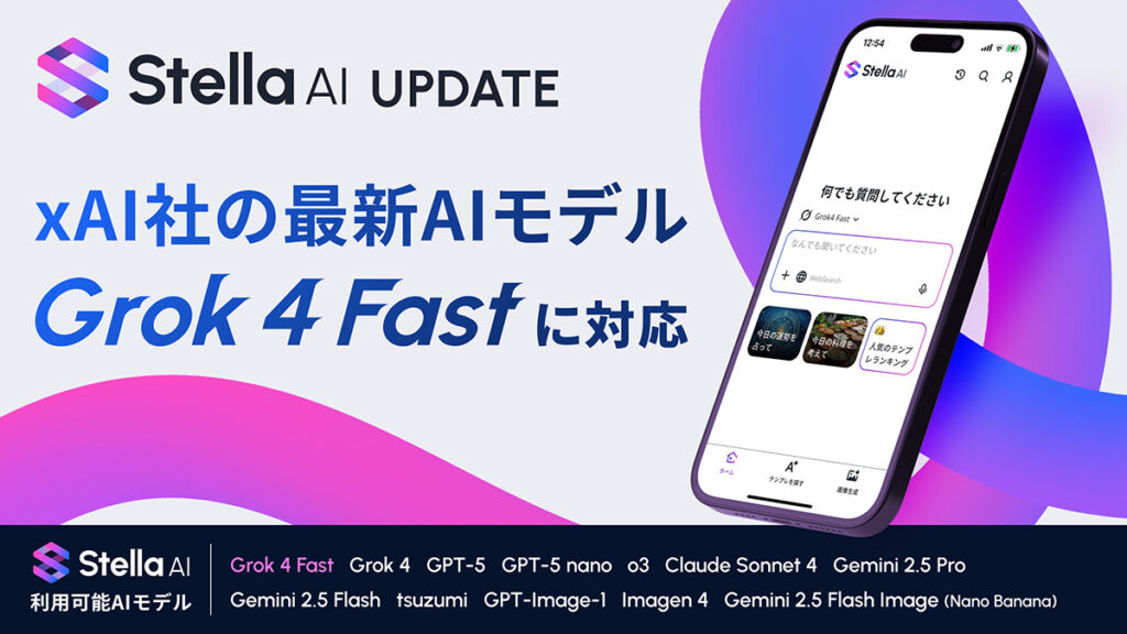 生成AIサービス開発を⼿掛ける株式会社SUPERNOVA(本社:東京都港区 代表取締役社長 木本 東賢 以下、当社)は、当社の生成AIサービス「Stella AI」および「Stella AI for Biz」で利⽤可能なAIモデルに、xAI社の最新AIモデル「Grok 4 Fast」を2025年9⽉24⽇(水)より追加します。