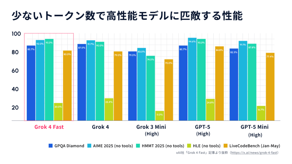 「Grok 4 Fast」は、AIモデルの性能を評価するベンチマークテストにおいて、高性能モデル「Grok 4」に匹敵する性能を、少ないトークン数で実現するモデルです。これにより、高い性能と高速な生成を両立しています。この高い性能と素早い生成スピードを活用して、私たちはよりイノベーティブな機能を拡充していきたいと考えています。