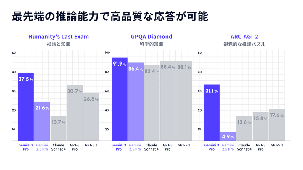 「Gemini 3 Pro」は、Google社が開発した最も知的なAIモデルで、最先端の推論能力を備え、あらゆるアイデアを実現できる革新的なモデルです。Humanity’s Last Examおよび GPQA Diamondでトップスコアを記録し、博士号レベルの推論能力を示しています。※