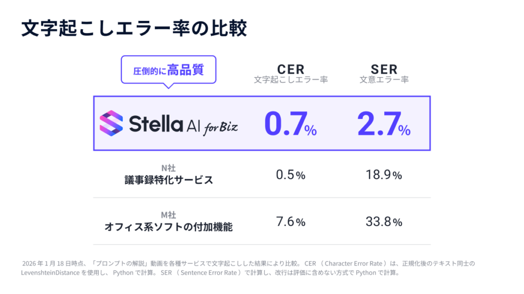 文字起こしの正確性を示すCER※2(Character Error Rate:文字誤り率)は0.7%、文レベルの誤り率を示すSER※3(Sentence Error Rate:文単位の誤り率)でも、2.7%を達成し、主要な文字起こしツールとの比較で最も高い精度を実現しています。