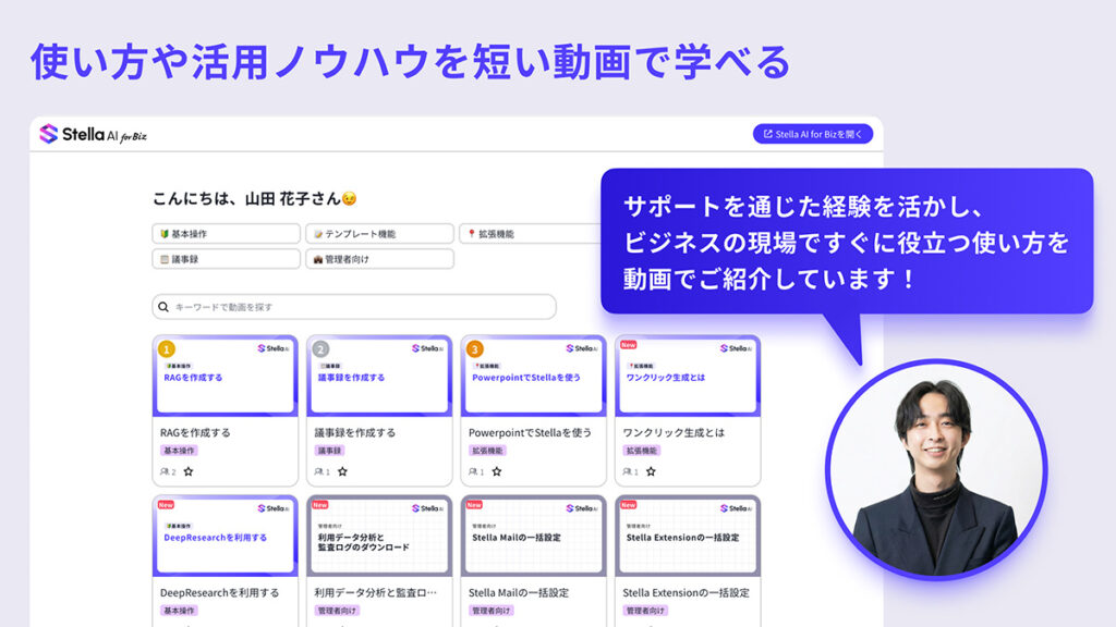 「Stella AI for Biz」の使い方・活用ノウハウを、短尺動画で学べる機能です。業務の合間に、必要なタイミングで、自分のペースで学習できます。コンテンツは、実際のお客さまサポートに従事しながら活用アドバイスを行っている当社 法人事業部長・後藤 僚介をはじめとした社員が制作しています。機能の解説から実践的な活用シーンの紹介まで、幅広く網羅しています。管理画面から受講状況も管理でき、組織でのAI活用促進をより加速させていきます。